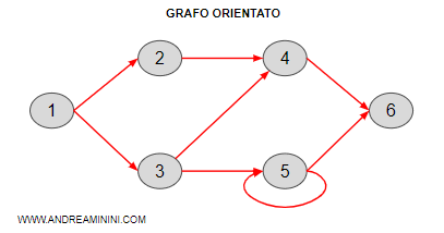 • Grafo orientato. I grafi orientati hanno gli archi con una direzione. In questo caso gli archi sono frecce. Ad esempio, si può andare dal nodo 1 al nodo 2 ma non viceversa, non si può passare dal nodo 2 al nodo 1.