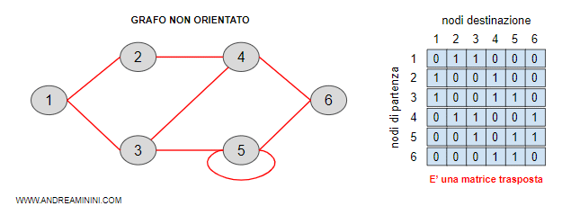 • La matrice di adiacenze. In nodi e gli archi sono memorizzati in una matrice quadrata nxn. Dove le n righe indicano i nodi di origine e le n colonne quelli di destinazione. Ogni elemento della matrice indica se i due nodi sono collegati tra loro (1) oppure no (0).