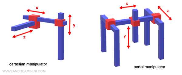 E' caratterizzato da tre giunti ortogonali tra loro. Ogni giunto fornisce un grado di libertà. L'area di lavoro è un parallelepipedo. L'accesso all'area di lavoro può essere laterale oppure dall'alto (manipolatore a portale). Quest'ultimo è adatto soprattutto se il peso del braccio e/o del carico è molto grande.