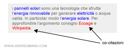 Esempio. Se il brand "Okpedia" viene citato insieme ai brand "Wikipedia" e "Treccani" in molti documenti esterni, allora probabilmente ne condivide lo stesso campo di competenza, finalità oppure si occupa di argomenti simili. Si tratta di un'euristica.