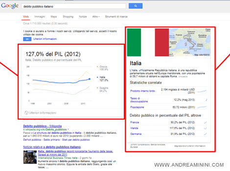 Ad esempio, recentemente Google sta pubblicamento nei risultati di ricerca delle informazioni strutturate tratte da Wikipedia e da altri database online. Quella che segue è la pagina dei risultati cercando "debito pubblico italiano".