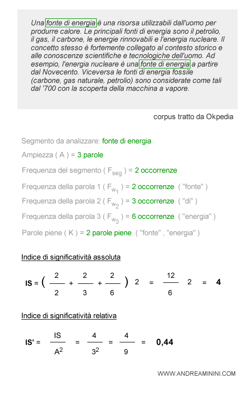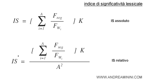 La formula dell'IS assoluto si calcola sommando il rapporto tra la frequenza del segmento nel corpus ( Fseg ) e la frequenza di ogni singola parola del segmento ( Fwi ) per tutta l'ampiezza del segmento ( A ) ossia per tutte le parole che compongono il segmento. La somma si moltiplica per il numero delle parole piene ( K ) del segmento.