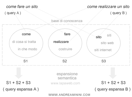 Riprendendo il nostro esempio, il search engine si accorge che le query A e B utilizzano gli stessi concetti S1+S2+S3. Sono query diverse ma hanno lo stesso significato. A questo punto, sostituisce le query iniziali con le query espanse.