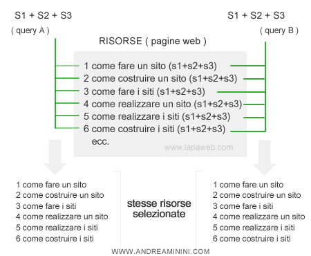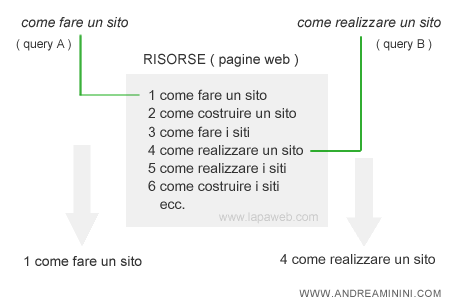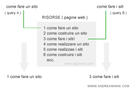 Nella prima pagina dei risultati l'algoritmo seleziona le risorse con i vocaboli come+fare+sito, mentre nella seconda seleziona quelle con la combinazione come+fare+siti.