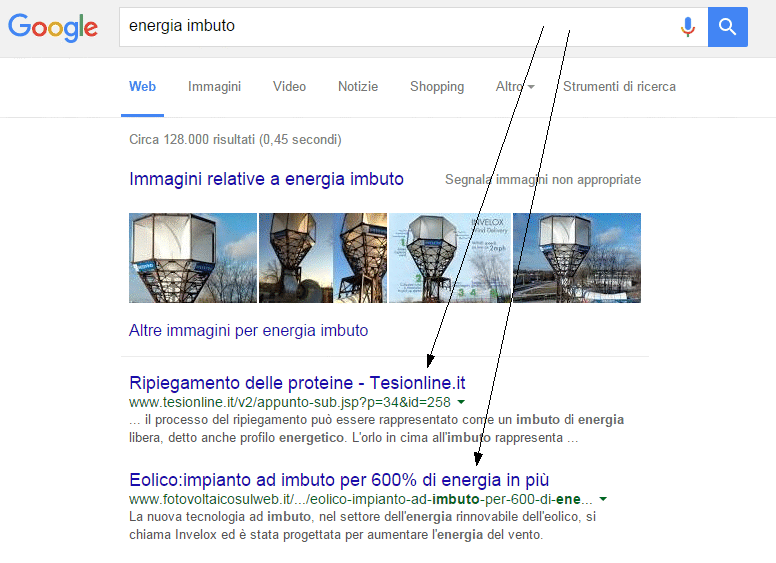 Da un lato questi risultati saranno più cliccati dagli utenti che cercano "imbuto+energia". Dall'altro, trattandosi di una nuova tecnologia, aumenteranno i documenti che contengono i due termini dentro lo stesso campo semantico ( eolico ).