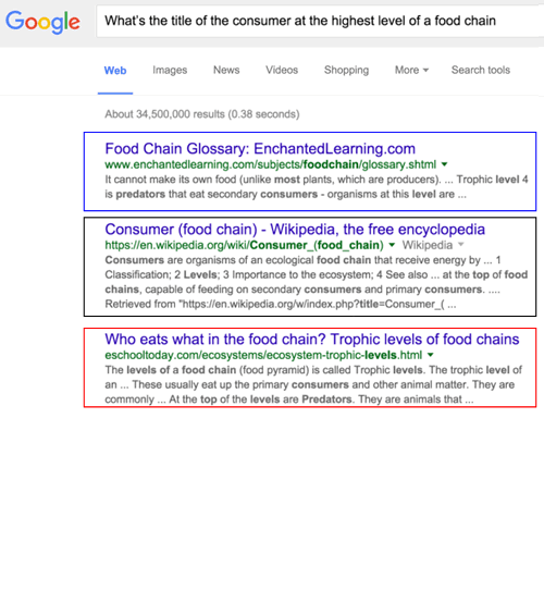 Esempio. Digitando una combinazione inusuale di parole chiave, si può vedere quest'algoritmo in azione. Quando Google non conosce le relazioni tra i termini di una query e le entità, non riesce a dedurre il contesto e il significato delle cose. Non può capire quali risultati sono rilevanti e quali no per l'utente.