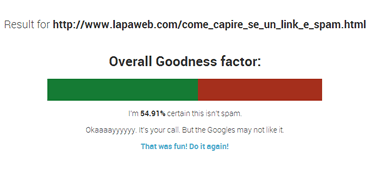 E' molto semplice da utilizzare. È sufficiente inerire un indirizzo URL, quello che sta linkando la vostra pagina, e attendere la risposta. Dopo pochi secondi il tool restituisce un indicatore percentuale del rischio di spam. Ad esempio, abbiamo fatto una prova con l'indirizzo URL di questa pagina, ottenendo un 54%, senza infamia e senza lode. Il risultato non è che ci entusiasmi. Dobbiamo sicuramente migliorare e, magari, iniziare anche noi a rifiutare qualche backlink ma non dovremmo essere un pericolo per chi linkiamo.