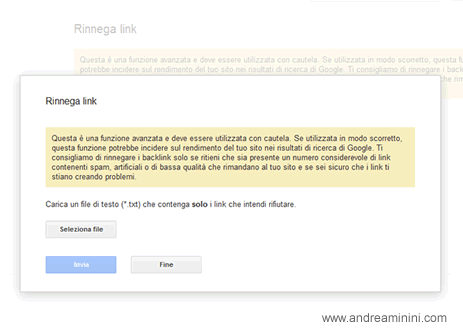 Dopo aver salvato il file di testo sul mio computer, mi collego alla funzione Disavow links di Google. È la funzione che permette di rinunciare ai link in entrata provenienti da siti web sgraditi. Il tool Disavow Links mi chiede di selezionare e di caricare il file TXT dove sono indicati i siti web da rinnegare, quelli contenenti spam, link artificiali, verso il proprio sito.