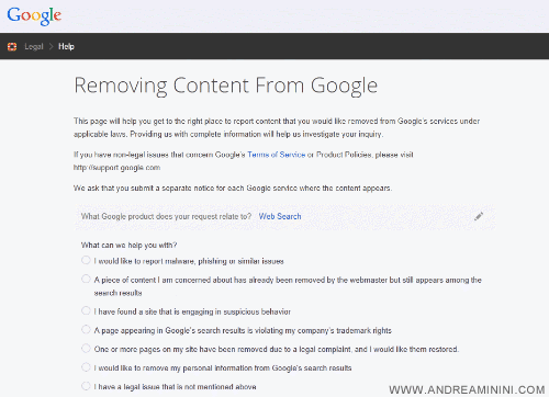 - Rimozione di contenuti. Questa funzione permette di segnalare lo spam engine, i siti di malware e phishing, pagine sospette che violano i diritti di proprietà dei marchi o il diritto alla privacy di terzi a causa della pubblicazione di informazioni personali, ecc