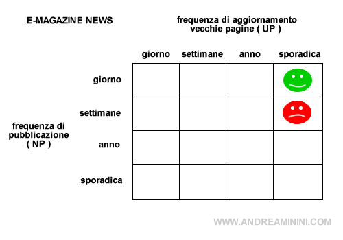 In questo caso l'assenza di nuovi articoli ( NP ) è un segnale molto negativo. Un magazine con scarsa frequenza di pubblicazione dei nuovi contenuti può subire un declassamento qualitativo sui search engine.