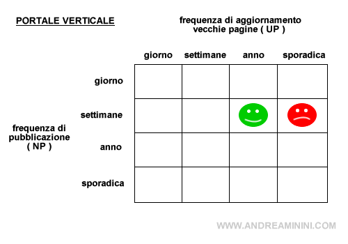 Un portale verticale ha bassa frequenza di produzione dei nuovi contenuti ( NP ), con cadenza settimanale o mensile, ma elevata frequenza di aggiornamento dei vecchi contenuti ( UP ).