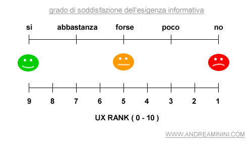 Nota. In alcuni casi, è utile usare anche una scala negativa fino a -10 UX quando la pagina non solo non soddisfa il bisogno informativo ma crea anche un danno all'utente finale. Ad esempio, se un sito diffonde dei virus o linka dei siti di phishing, va penalizzato maggiormente rispetto a uno che si limita a non soddisfare l'esigenza informativa dell'utente.