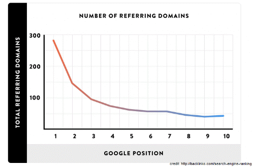 Guardando la curva dello studio di Backlinko emerge una chiara correlazione tra il numero dei domini linkanti verso una pagina ( landing page ) e il suo posizionamento sulle pagine dei risultati di ricerca di Google.