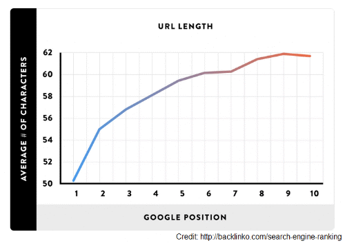 Secondo la ricerca, gli indirizzi URL più corti sembrano posizionarsi meglio su Google rispetto a quelli lunghi.I risultati nelle prime posizioni hanno in media 50 caratteri, mentre quelli alla fine della pagina dei risultati ne hanno 60-62.