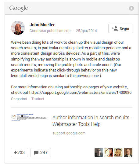 Con il senno di poi, un primo segnale di questa strategia è arrivato lo scorso giugno 2014, quando John Mueller annuncia su Google+ la decisione di Google di togliere le faccine dell'authorship dalle Serp.