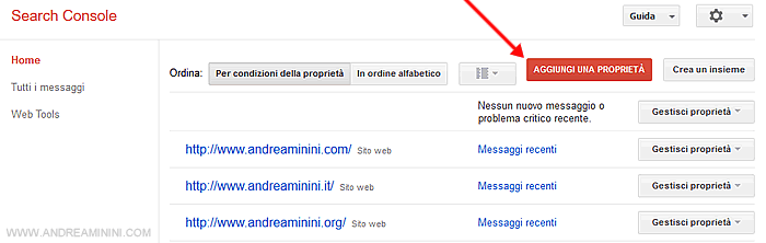 Entro sulla home della Search Console di Google con il mio account e clicco sul pulsante Aggiungi una proprietà. Si trova in alto a destra.