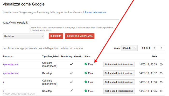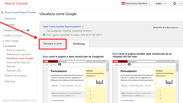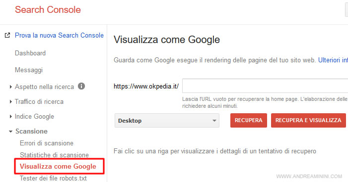 Una volta verificata la proprietà, utilizzo la funzione Vedi come Google per controllare se il crawler di Google legge il sito.