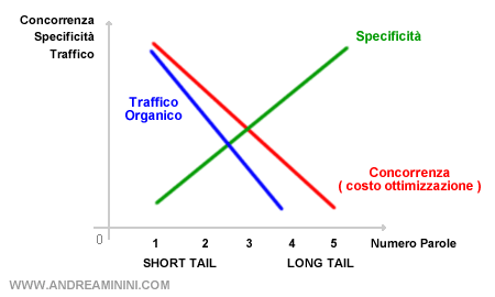 Il numero dei simboli grafici in una parola chiave è direttamente correlato al grado di specificità della keyword, intesa come vicinanza a un significato/bisogno ben preciso, e inversamente correlato al grado di competitività ( costo ) e al traffico organico ottenibile dal search engine.