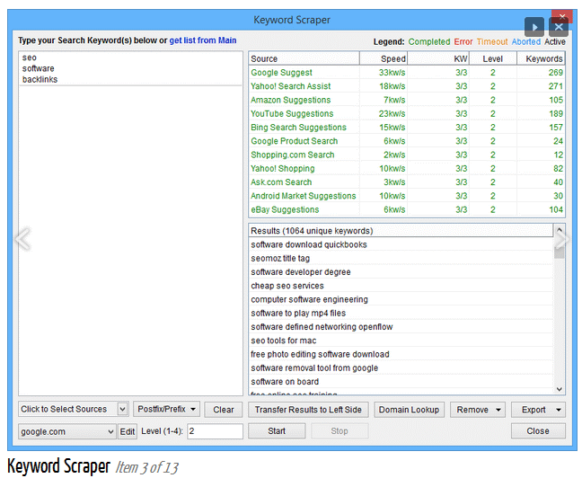 - Scrapebox. E' un software SEO di analisi, fornisce diverse informazioni tra le quali anche una funzionalità keyword Search. Si installa sul computer e funziona dal lato client, usando dei proxy per cercare le informazioni sui motori di ricerca.