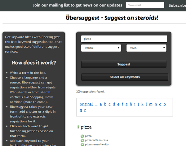 - Ubersuggest. E' un servizio gratuito abbastanza noto tra i webmaster. Digitando una main keyword il tool restituisce un elenco delle secondary keyword in ordine alfabetico.