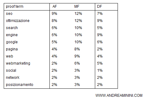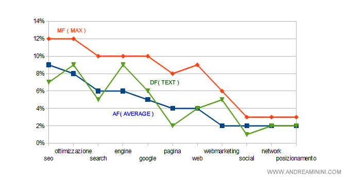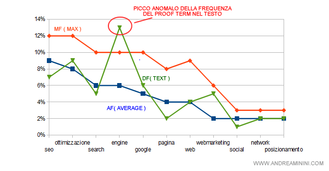 A questo punto, il search engine calcola la frequenza dei termini nel documento ( DF ) e la confronta con la distribuzione ideale ( AF / MF ).