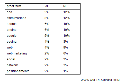 A ciascun tema ( topic ) è associato un elenco di termini pertinenti. Ad esempio, per il topic "ottimizzazione search engine" l'elenco dei termini rilevanti potrebbe essere il seguente:
