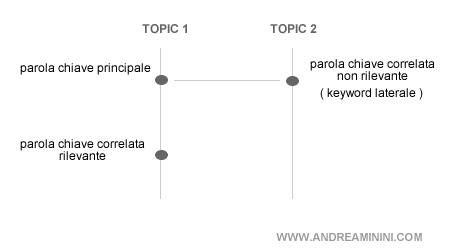 - Le parole chiave correlate non rilevanti. Sono pertinenti con l'argomento ma non sono così rilevanti per l'utente. Sono utili per declinare i contenuti del sito su altri campi semantici, prossimi a quello più rilevante, per espandere in orizzontale il posizionamento organico sulle SERP. In pratica, sono keyword laterali su argomenti differenti ma comunque vicini al tema principale.