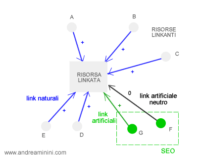 Ad esempio, il motore di ricerca si accorge del link artificiale da parte della risorsa F e, quindi, non lo considera valido attribuendogli un valore pari a zero ( link neutro ) e penalizza la risorsa linkante ( F ) per contrastare la pratica dei link artificiali.