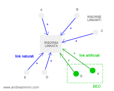 Ad esempio, la presenza dei link artificiali dalle risorse F e G influenza sensibilmente i risultati dei motori di ricerca nei confronti della risorsa linkata, facendogli credere che è più importante di quello che sia veramente ( vedi differenza tra link naturali e link artificiali ) .