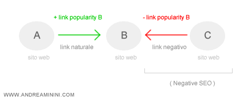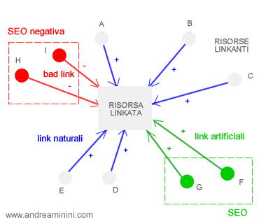 Ad esempio, nello schema precedente le risorse H e I hanno una pessima reputazione e inseriscono un collegamento ipertestuale maligno ( rosso ) verso la risorsa linkata, a sua insaputa, al solo fine di infangarne la reputazione. Chi scopre di essere vittima del SEO negativo deve comunicare al motore di ricerca di non volere questi link per evitare di essere penalizzato dl motore di ricerca ( vedi come rimuovere i bad link artificiali ).