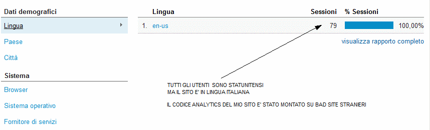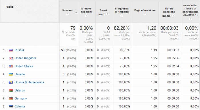 E' sufficiente guardare la provenienza geografica degli utenti per rendersene conto. Si tratta di un sito italiano ( senza codice di monitoraggio ) ma tutto il falso traffico rilevato da Analytics proviene dall'estero.