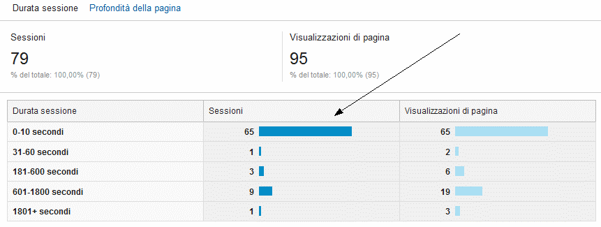 Anche i dati sul tempo di permanenza dei visitatori sul sito sono pessimi. Quasi tutte le false visite sono sotto i 10 secondi.