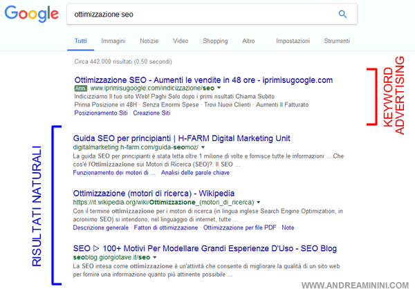 Esempio. L'acquisto delle keyword sui motori di ricerca ( keyword advertising ) è un'attività SEM. In questo caso si tratta di un'azione pubblicitaria che utilizza il motore di ricerca come media. E' un risultato sponsorizzato. Non si tratta di ottimizzazione SEO.