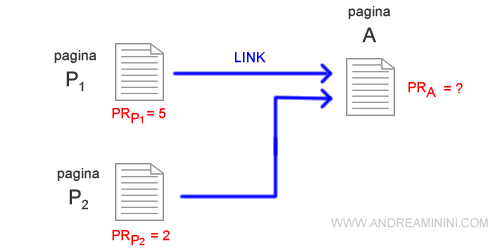 La pagina A è linkata da due pagine P1 e P2 che hanno rispettivamente PR5 e PR2.