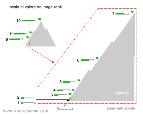 Nota. La scala del page rank è logaritmica. Pertanto, il PR1 non è la metà del PR2. Quest'ultimo vale più del doppio del precedente. La distanza è maggiore. E così via.