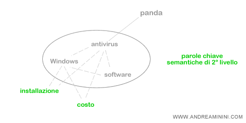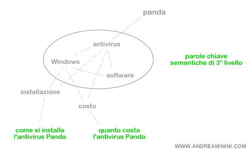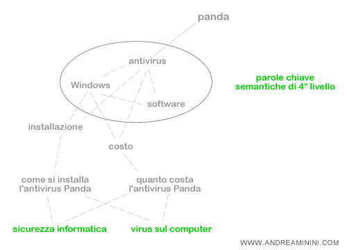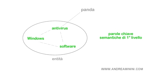 La relazione tra i termini "Panda" ( core keyword ) e "antivirus" ( parola chiave semantica di 1° ) ci consente di individuare l'entità di riferimento ed escludere tutte le altre.