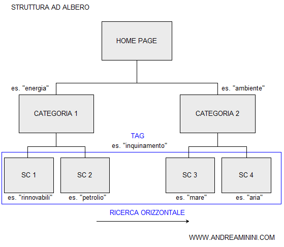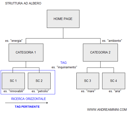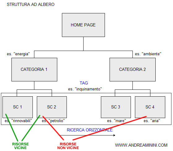- Tassonomie orizzontali vicine. Le risorse selezionate sono tutte pertinenti rispetto a un argomento principale di riferimento. Pertanto sono molto vicine tra loro. In genere, si tratta di una ricerca orizzontale effettuata soltanto in una ramificazione della struttura del sito, ossia all'interno di un gruppo di sottocategorie, tramite un tag pertinente.
