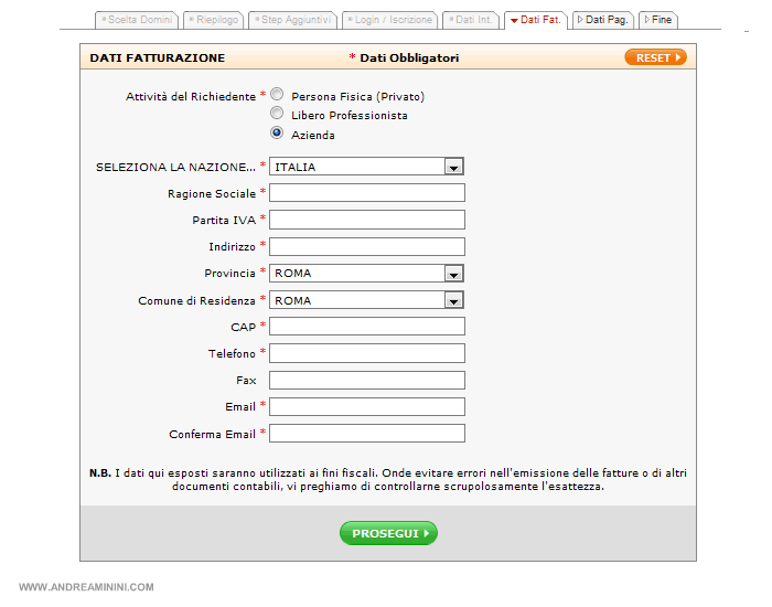 Nella schermata successiva compilo i dati di fatturazione. Chi acquista il servizio può anche essere diverso dall'intestatario. In questo caso, sto acquistando il sito web per me stesso, quindi compilo i dati di fatturazione con i miei dati e poi clicco su Prosegui.