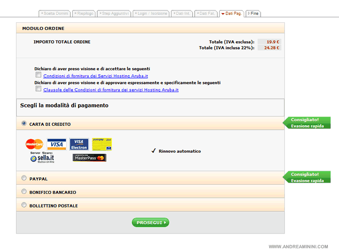 La procedura di acquisto è quasi finita. Devo solo accettare le condizioni di servizio e indicare come voglio pagare. Ci sono quatto metodi di pagamento ( carta di credito, Paypal, bonifico bancario o bollettino postale ). Seleziono il metodo di pagamento e clicco su Prosegui.
