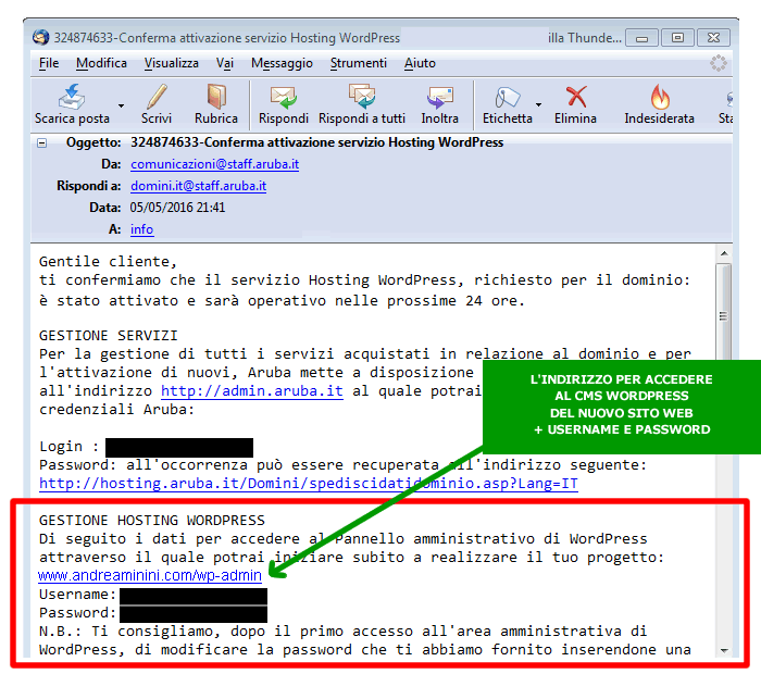 Dopo aver inoltrato e pagato l'ordine con la carta di credito, attendo l'attivazione del servizio da parte di Aruba. Dopo poche ore Aruba mi invia tramite email l'avviso che il sito web è online e mi invia la login e la password per accedere al CMS Wordpress.