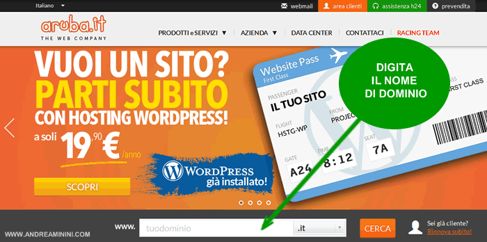 Sono andato sulla home page di Aruba e ho iniziato a cercare un nome di dominio di mio interesse. Quello che voglio usare per il nuovo sito web. Digito il nome del sito nella casella di ricerca e clicco sul pulsante Cerca.
