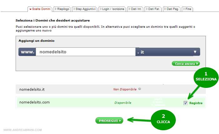 Alla fine ne trovo il dominio libero sotto l'estensione .com. Va bene, il nome mi piace e vado avanti. Spunto la casella del dominio e poi clicco sul pulsante Prosegui in basso.