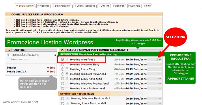 A questo punto, per avere un sito con Wordpress già preinstallato, nella pagina seguente devo selezionare la voce Hosting Wordpress.