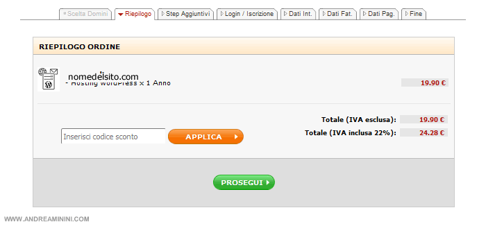Nella pagina successiva Aruba mi chiede se ho un codice sconto. Non ce l'ho, quindi clicco sul pulsante Prosegui.
