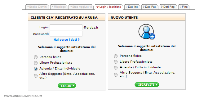 E se non ho la login e password? Chi non è ancora registrato su Aruba deve, invece, registrare un nuovo utente usando il riquadro a destra. Seleziona il soggetto intestatario del dominio ( persona fisica, libero professionista, azienda, ditta individuale o altro ) e poi clicca sul pulsante Iscriviti per proseguire la procedura di registrazione. L'iscrizione non ha costi aggiuntivi.