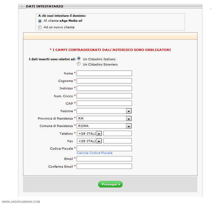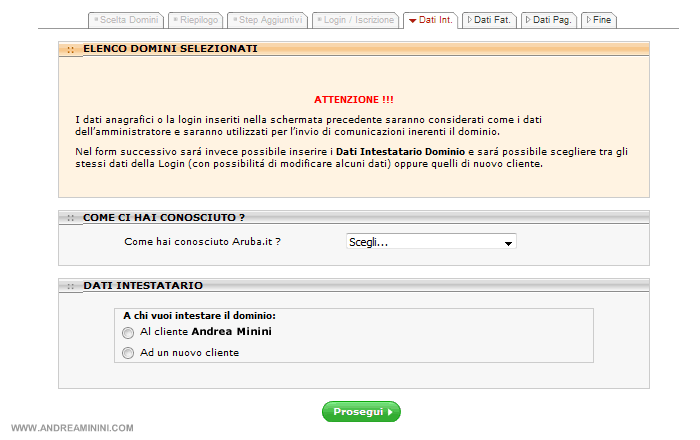 Compilo i dati dell'intestatario del dominio. In questo caso devo indicare i miei dati personali ( nome, cognome, indirizzo di residenza, cap, telefono, codice fiscale, email ). Dopo aver compilato tutti i campi clicco sul pulsante Prosegui in basso.