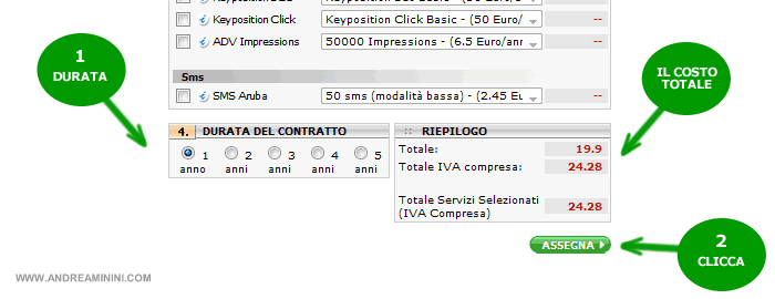 Scorro la pagina verso il basso e tolgo la spunta dalle altre voci preselezionate. In fondo alla pagina trovo il preventivo automatico del costo totale. Scelgo come durata un anno e clicco sul pulsante Assegna per continuare l'acquisto.