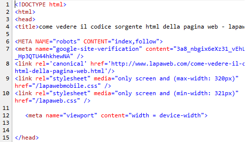 Si tratta del codice scritto in linguaggio HTML che permette al browser di organizzare i testi, i link e le immagini di un documento così come li vediamo sullo schermo. Gli utenti non visualizzano questo codice ma soltanto il risultato finale. L'accesso al codice è però molto utile per chi sviluppa e realizza siti web. Un esempio di codice sorgente in linguaggio HTML è il seguente: