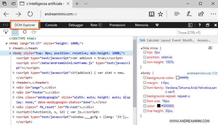 Per vedere il codice sorgente di una pagina web su Edge basta cliccare il tasto funzione F12.