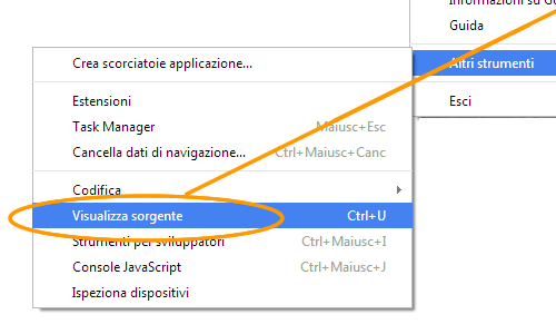 Il browser di Mountain View, Google Chrome, offre due possibilità di accesso al sorgente della pagina. Dal menù principale possiamo cliccare sulla voce "Altri Strumenti" e selezionare "Visualizza sorgente" come nella seguente figura.